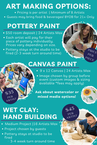 At the time of booking a $50 non-refundable deposit will be required to secure the date for your group. We ask that you have at least 8 artists with a maximum of 24. Each artist will choose a pottery piece to glaze. All pottery is individually priced with an average of $25-30. Each artist is able to pay separately at the time of check out.